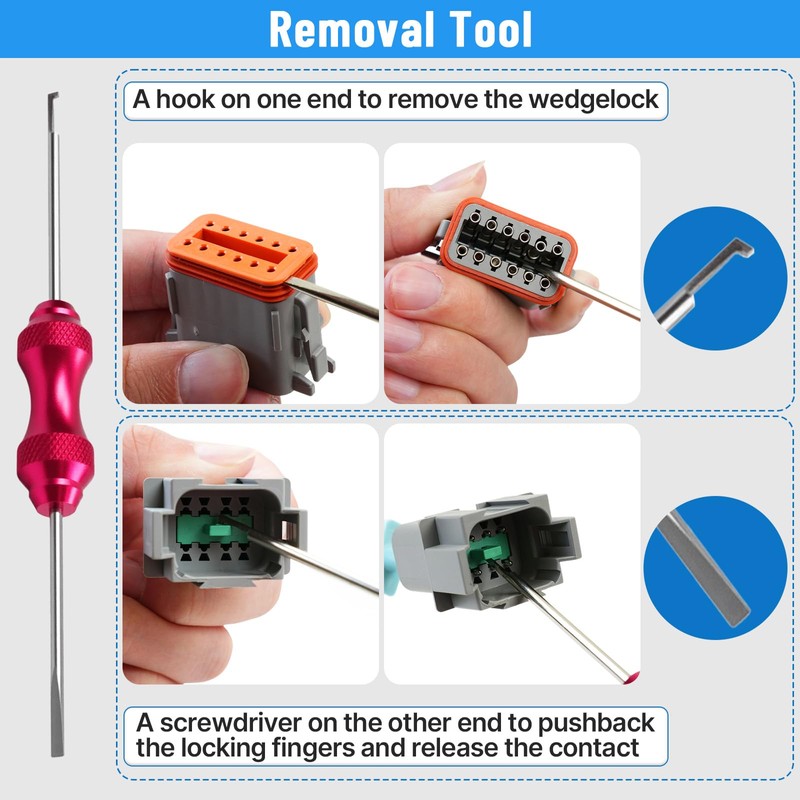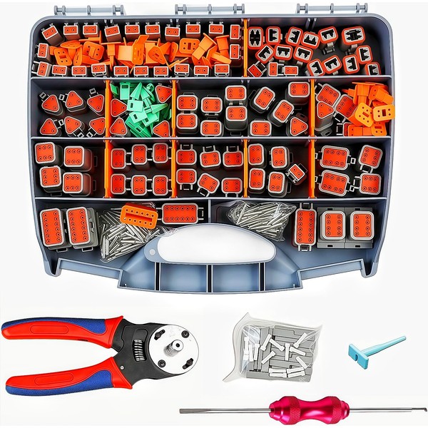 - 【DT connector kit】: 2pin*22 set, 3pin*6 set, 4pin*14 set, 6pin*4 set, 8pin*2 set, 12pin*2 set DT connectors with Crimping tools. Size 16-pin/receptacle (14-20 AWG), with sealing plug and Deutsch connector removal tool, meeting your needs