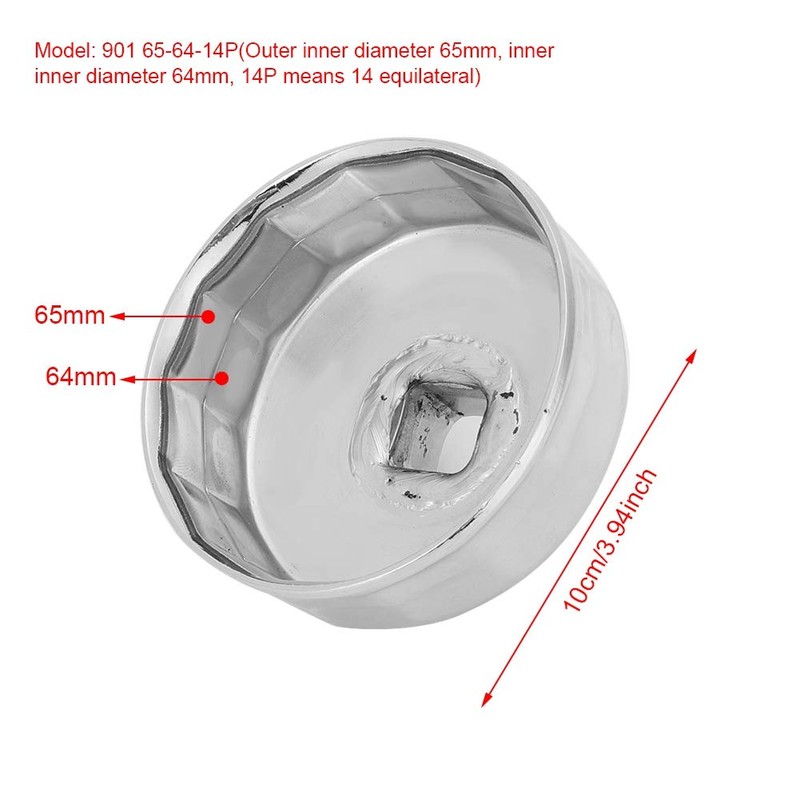 - Specifications ---- Material: Stainless steel, Size: Approx. 10*10*10cm/3.94*3.94*3.94inch, Model: 901 65-64-14P(Outer inner diameter 65mm, inner inner diameter 64mm, 14P means 14 equilateral), Wrench joint: 1/2inch, Package list: 1 x Oil Filter Wrench
