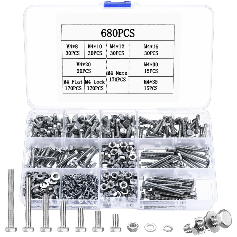 - Package includes: total 680 pieces, sizes and quantities include: 30 pieces M4 x 8 mm, 30 pieces M4 x 10 mm, 30 pieces M4 x 12 mm, 30 pieces M4 x 16 mm, 20 pieces M4 x 20 mm, 15 pieces M4 x 30 mm, 15 pieces M4 x 35 mm, 170 pieces M4 washers, 170 pieces M4 spring washers, 170 pieces hex nuts, sufficient quantity and large sizes to meet the usage requirements of multiple scenarios and areas.