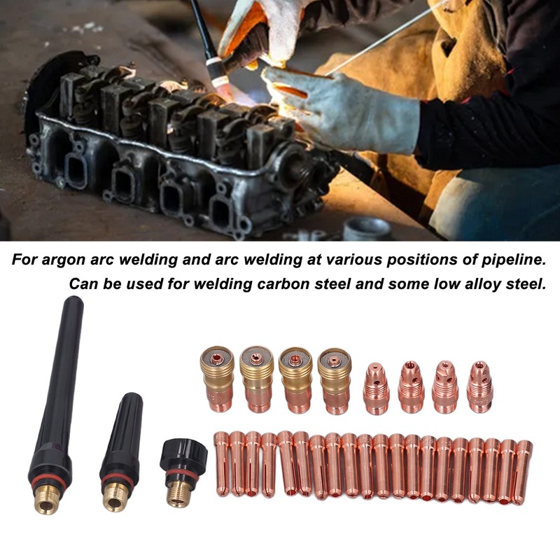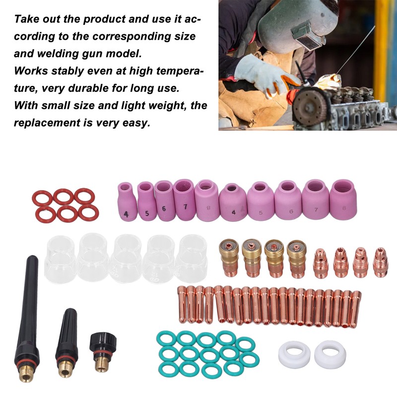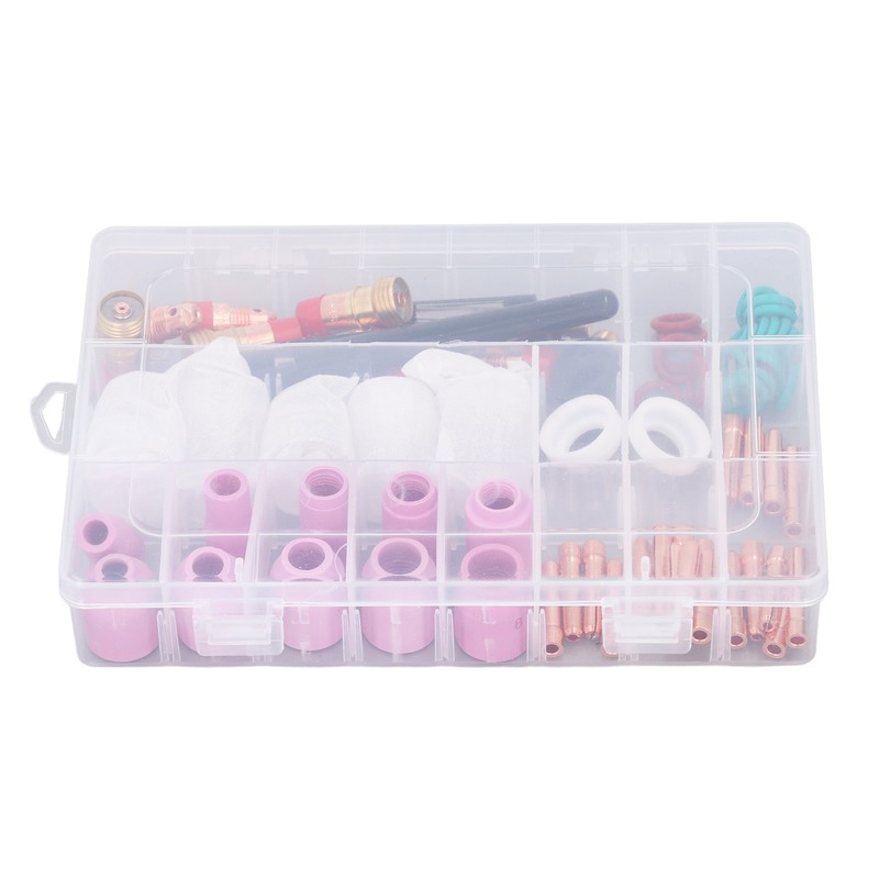 1、Good Material: Using premium copper and PTFE materials, these tools have great plasticity, toughness and crack resistance. 2、Practical Use: Suits perfectly for 17 and 26 series air cooled welding gun as well as 18 series water cooled welding gun. 3、68Pcs in Pack: Comes with 5pcs 12# glass cup, 3pcs pressure cap, 4pcs short connector, 10pcs ceramic nozzle and so on. 4、Welding Accessory: Used for TIG welding and arc welding of pipeline, and can weld carbon steel and some low alloy steel. 5、Easy to Install: Designed to have a compact size and a light weight, the installation is very convenient to complete.