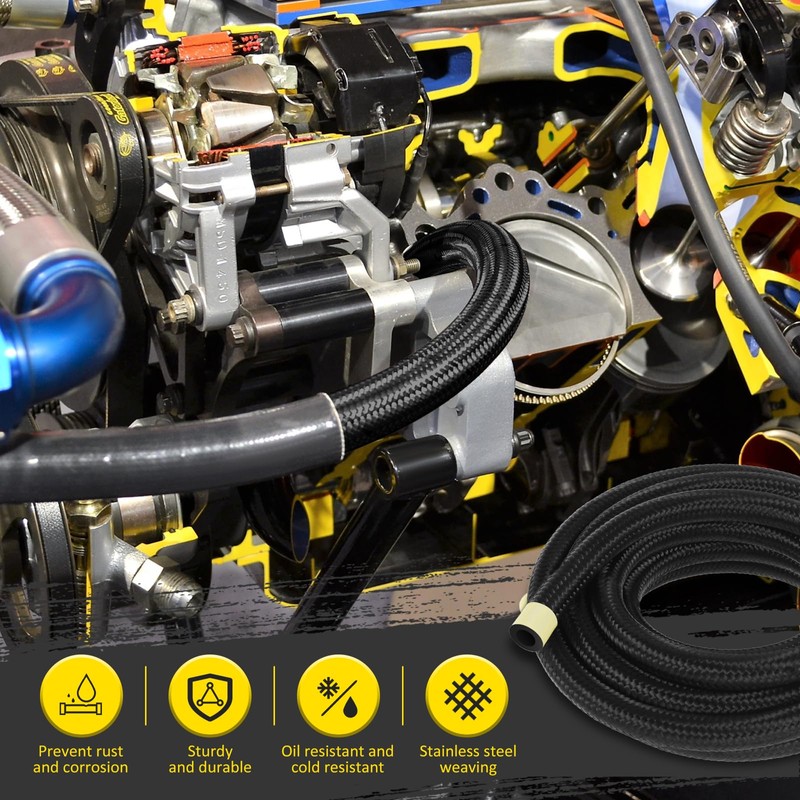 - Good Oil Resistance: Ideal for fuel lines for vehicles that require a large diameter engine. It has a diameter of 3/8 inch which helps in better flow and suction of fuel. This 6AN braided hose ensures that the vehicle engine is able to handle fuel optimally.The 6AN fuel line is available in lengths of 10 feet, which is sufficient for a variety of applications.