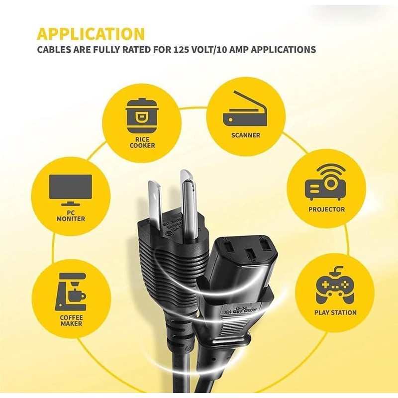 - VERSATILE CONNECTION - 3 prong replacement cord fits most desktop computers, HDTV, monitors, ceiling mounted projector, powered speakers, laser printer, guitar amps, keyboards, game consoles, TVs, power supplies. Connects from your equipments 3 pin socket to a standard 3 pronged 120V AC outlet.