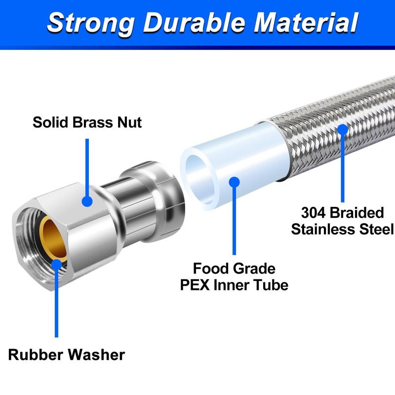 • 【Prime outer material】:The water line outer layer is wrapped with superior grade 304 stainless steel braided wire;Make the hose have excellent anti-rust and explosion-proof performance,even in wet and messy corners,there is no need to consider replacement for several years.
