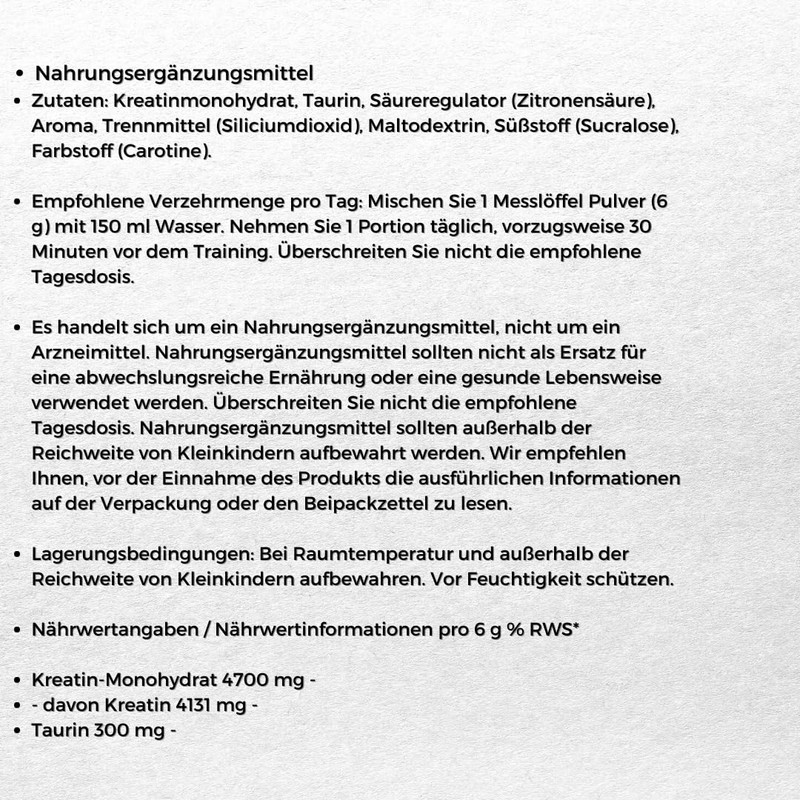 - Wenn Sie mit einer Kreatin-Supplementierung beginnen möchten, sollten Sie unbedingt 6PAK Nutrition Creatine Monohydrate ausprobieren, das in 3 ausgezeichneten Geschmacksrichtungen erhältlich ist und zusätzlich mit Taurin angereichert wurde. Jede Packung enthält bis zu 83 Portionen!