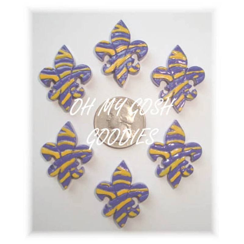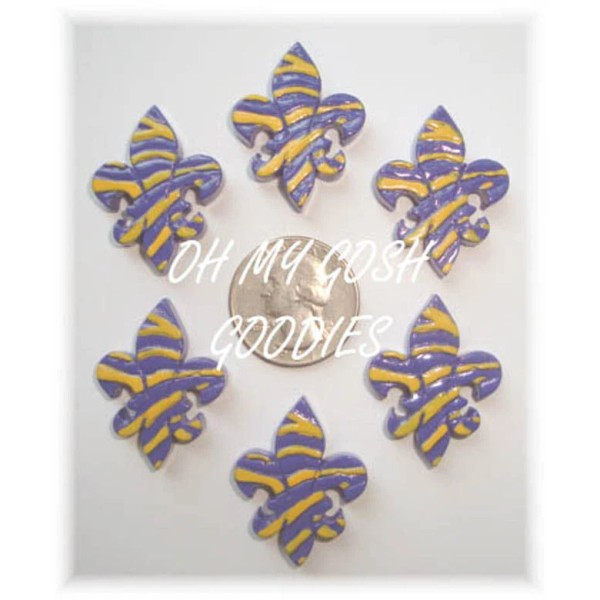 6PC FLEUR DE LIS ZEBRA GOLD PURPLE FLATBACK RESIN CHEER 4 HAIRBOW BOW CENTER