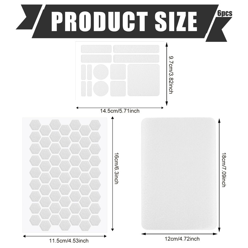 - Product List: You will receive 2 sheets of pre-cut multi-shape grip tapes (round, square, rectangle), 2 sheets of pre-cut hexagonal grip tapes, and 2 pieces of full sheet anti-slip grip tapes for custom cutting. Sufficient quantity for versatile use.