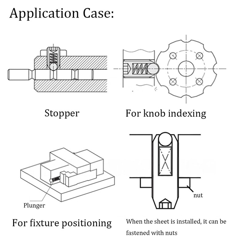 Ball plunger is used for fixing point, fixed indexing, positioning, grading, locking, locking, latching, ejecting, lifting.