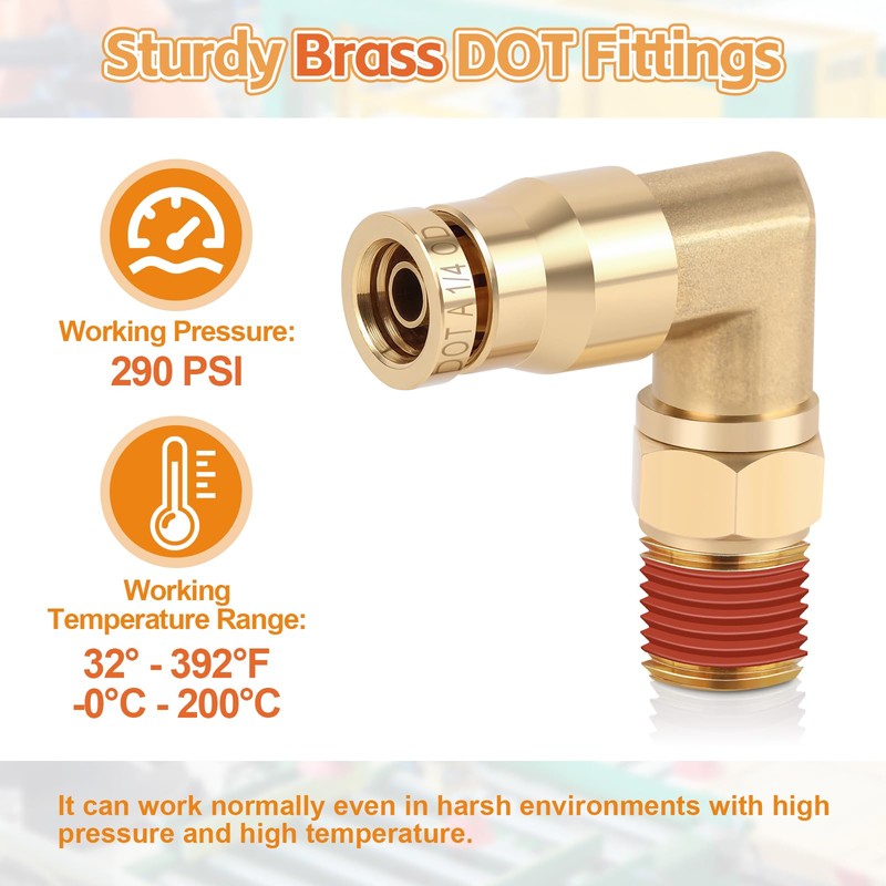 This elbow brass dot air brake fittings set, offers you flexible and diverse choices.It includes five commonly used outer diameter sizes to choose from (1/4"OD ×1/8"NPT, 1/4"OD×1/4"NPT, 1/4"OD ×3/8"NPT, 3/8"OD ×3/8"NPT, 3/8"OD×1/2"NPT). Each set features 6 uniform-specification dot air brake fitting,allowing you to freely combine them according to your actual engineering needs.