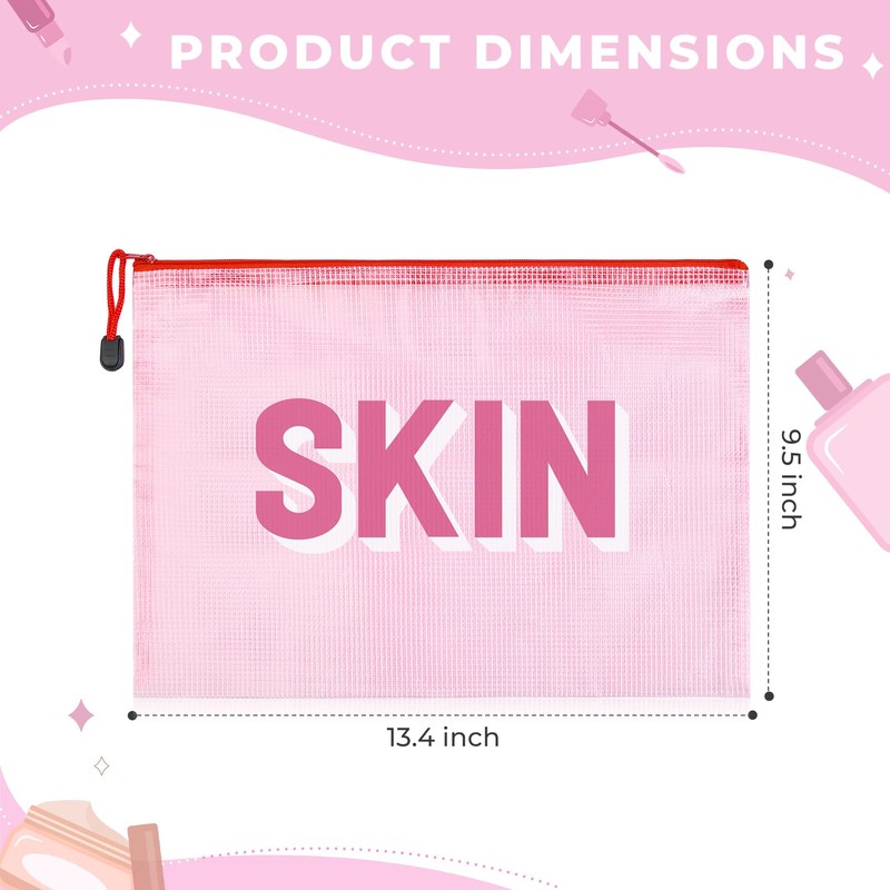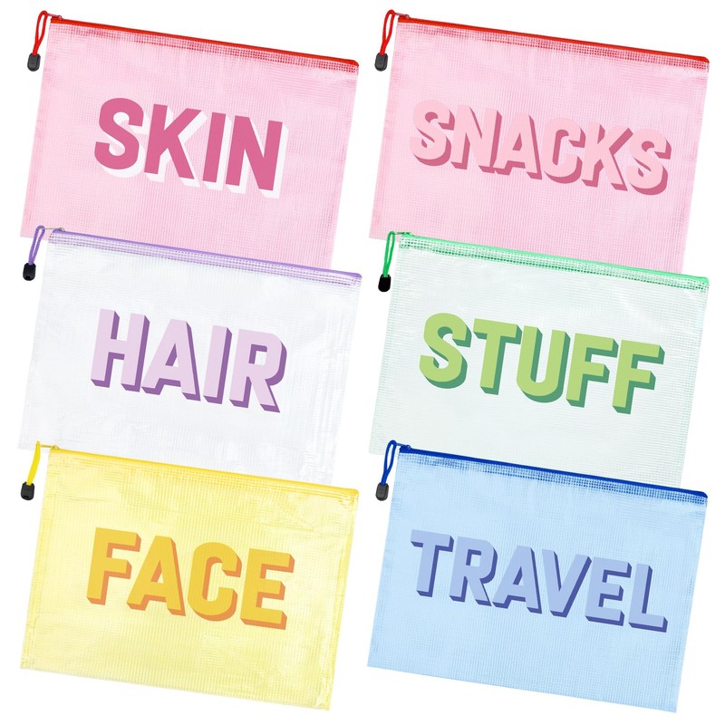 - Vibrant & Stylish Design – Add a fun and trendy touch to your essentials with our 6-Pack Makeup Bags. Each bag is printed with bold "SKIN," "HAIR,"SNACKS," "FACE" "TRAVEL " and "STUFF" lettering, making it easy to stay organized while traveling. The colorful design and symbol accents make them a stylish accessory for any occasion!