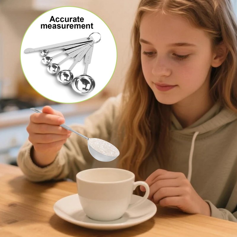 Product Name: Stainless Steel Measuring Spoon Set with Keychain – 5 Spoons & 1 Ruler, 1/8TSP to 1TBSP, Easy Storage, Multifunctional for Oil, Salt, Spices, and More