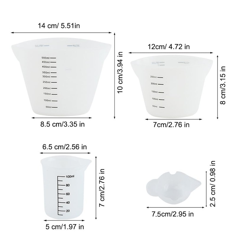 - SILICONE MATERIAL: Made from premium silicone, these measuring cups are durable, flexible, and heat-resistant. They can withstand high temperatures without warping or melting, making them safe to use in the kitchen or with hot epoxy resin.