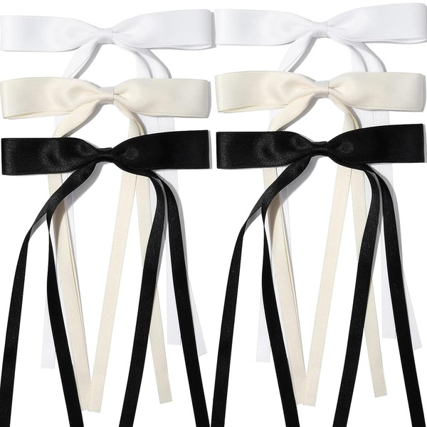 6PCS Silky Satin Hair Bows Ribbon Hair Clips, Ribbon Satin Hair Bows with Long Tail Tassel Bow Clips BowKnot Barrettes Hair Accessories for Women Girls (Black+Beige+White)