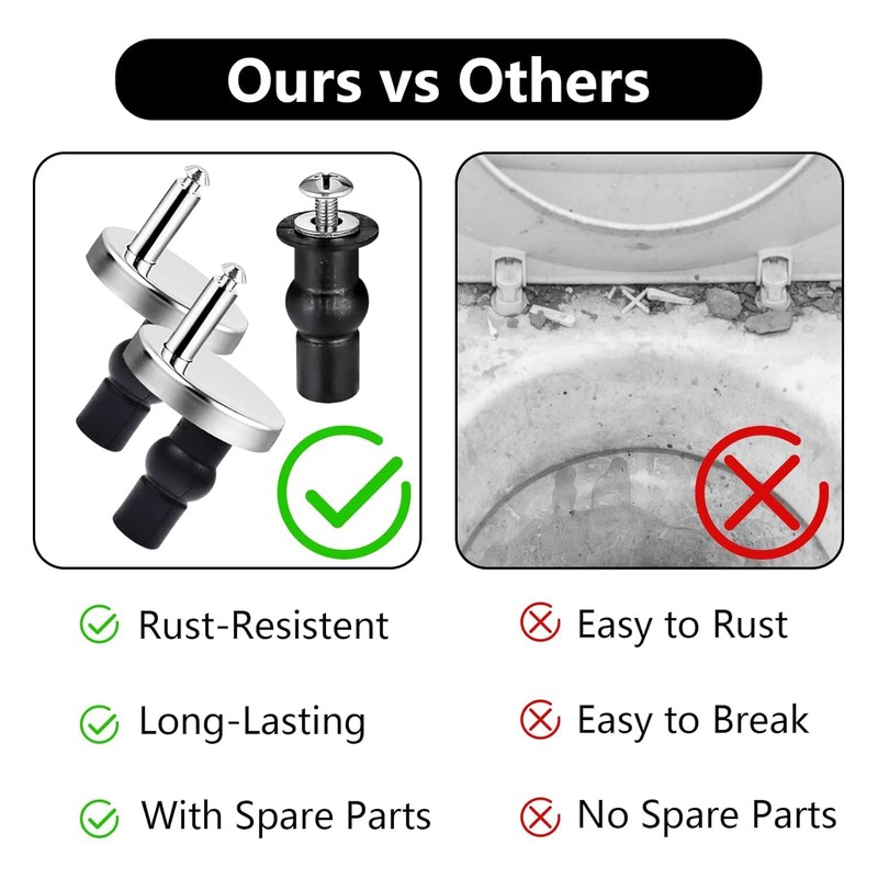 - 【Complete Kit Included】Quick release toilet seat fixings enjoy a seamless, long-lasting toilet seat installation with our comprehensive toilet seat fixings set. Inside, you'll find two complete sets of toilet hinge screws fittings, plus 2 additional rubber jackets with screw and gasket and 2 nylon expansion plug with screw and gasket.
