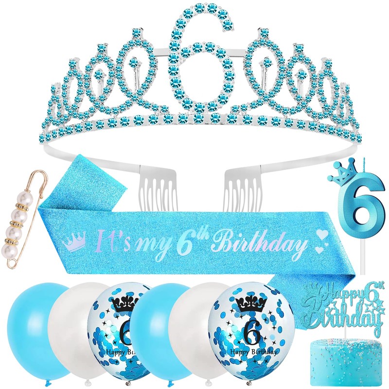 - 6th Birthday Decorations: 6th birthday blue princess party decorations includes: "It's My 6th Birthday"Blue Glitter Sash, 6th Blue Rhinestone Birthday Crown Tiara, 6th Birthday Candles, 6th Birthday Cake Topper, 6pcs Birthday Balloons 10inch(2X Pearl Blue, 2X Pearl White, 2X Blue Sequin Balloons), Pearl Pin. All these are well packed in a BOX.