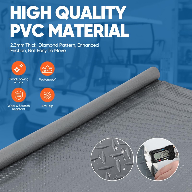 - SIZE COMPATIBILITY: The garage floor mat is made of heavy-duty PVC material. By using this rubber mat for garage, you can effectively prevent direct contact between tires and the floor, reducing damage caused by friction, gasoline stains, or other chemical substances. Additionally, this garage parking mat measures 7.5 ft by 17 ft. Its spacious design easily accommodates sedans, golf carts, pickup trucks, compact SUVs, and motorcycles, providing comprehensive protection for your floor.