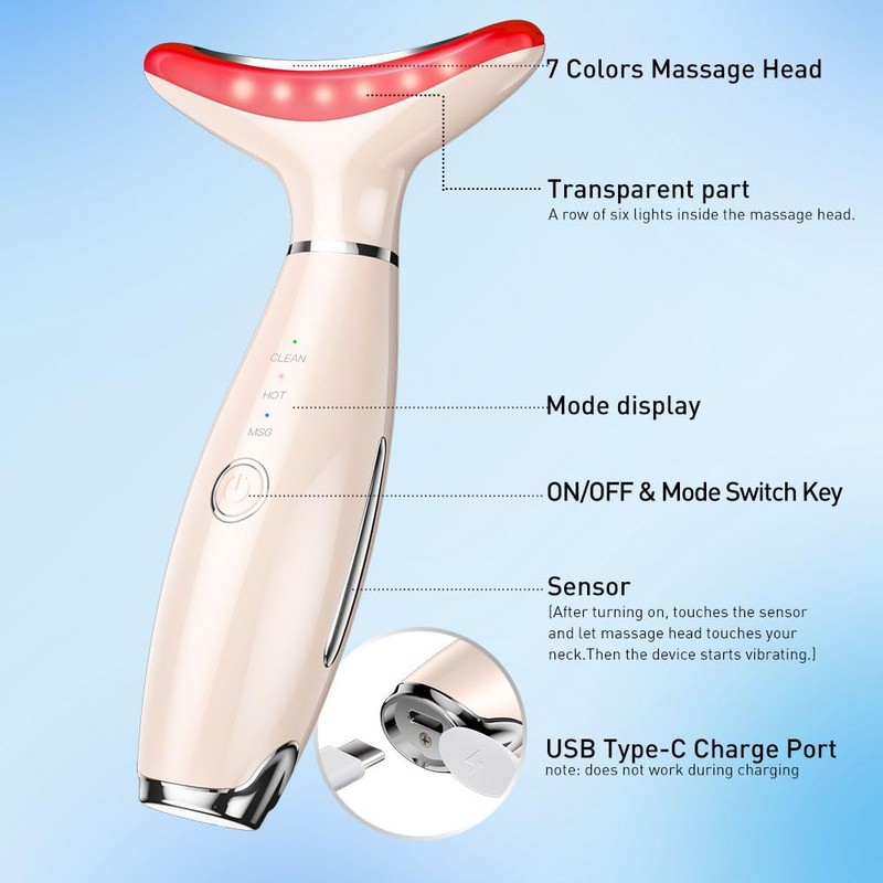 - 3 Mode & 7 Color Face Massager: Our product has 3 massage modes, including Clean, MSG and Hot Mode, with heat and vibration on the face and neck skin, all modes have 7 different light colors, can greatly help you relax and use it with skin-care products, such as serums, moisturizers, creams for a better effect