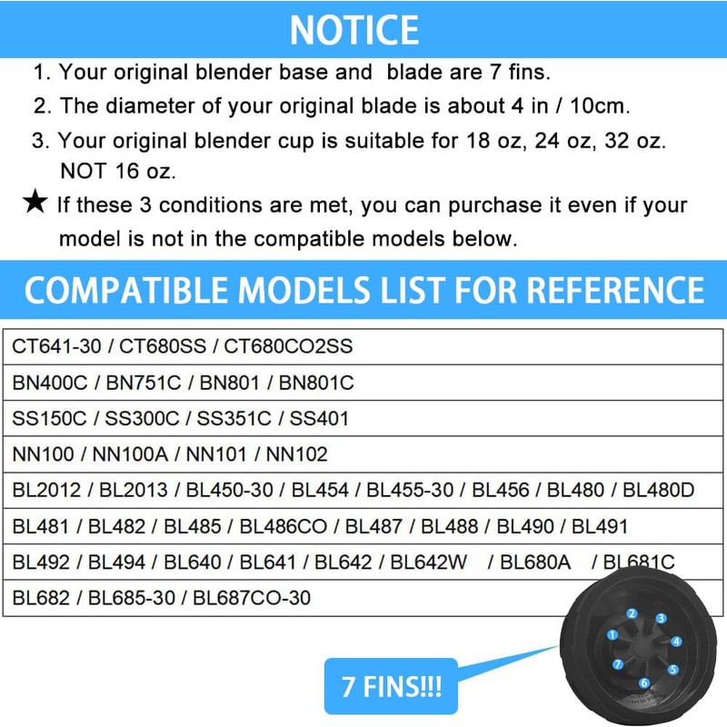 - [Perfect Compatibility] – Specifically designed to fit, to fit blenders, this BN801C, BN751C, BN801, BN750C, BN400C, BL480, BL480D, BL488, BL488W, BL640, BL641C, BL642, BL680A, BL681C, BL682, SS351C, CT680SS.with Rubber Gasket Blender Replacement Parts is an exact match for seamless installation and optimal performance.Please confirm your blender need 7 fins replacement blade before purchasing. (Only suitable for 18 / 24 / 32 oz cups, not 16 oz)