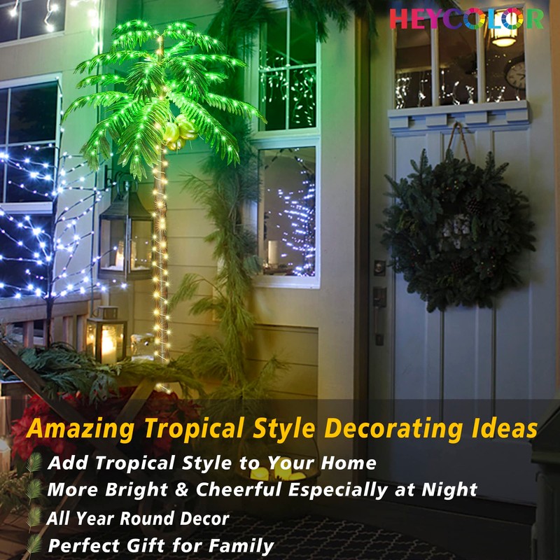 - Specification: The lighted palm tree for outside decoration is 7 FT height, designed with LED lights, include green led lights hidden in the fabric leaves, and warm white led lights attached to the brown trunk