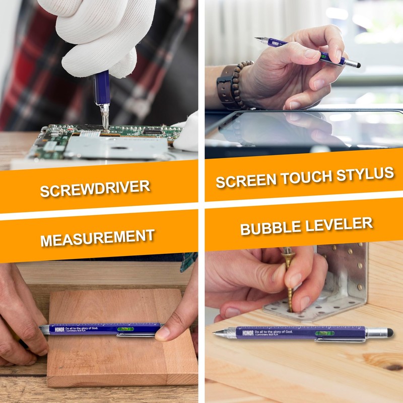 7 in 1 Multitool Pen With Scripture - Honor: 1 Cor. 10:31 - Multi Tool Pen Screwdriver With Level, Ruler & Stylus - Blue Construction Pen As Christian Gifts For Men & Fathers, Dad Gadgets