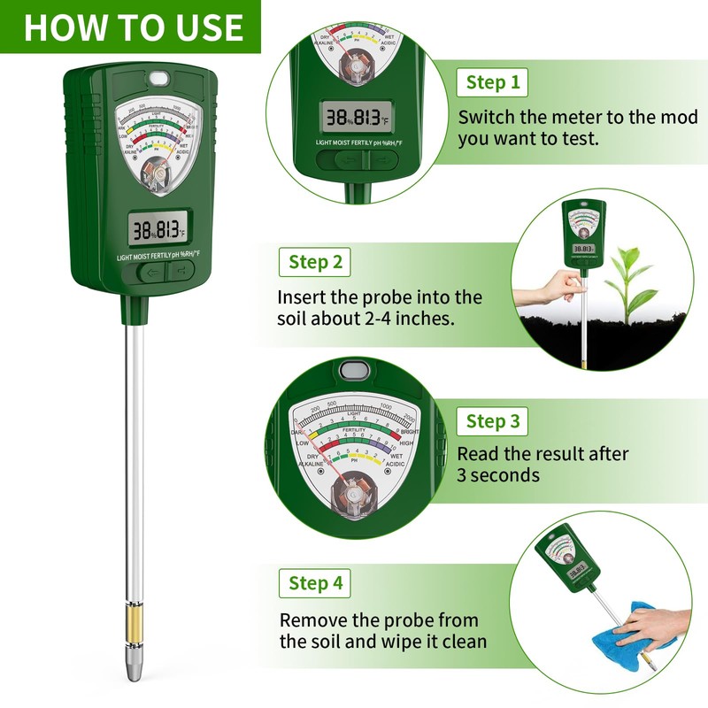 - 【Single-Probe Less Hurts】This plant test kit with single-probe. Compared to traditional dual probes, a single probe can reduce damage to plant roots when insert into the soil and doesn't dig up too much soil after test. A reliable plant care tool