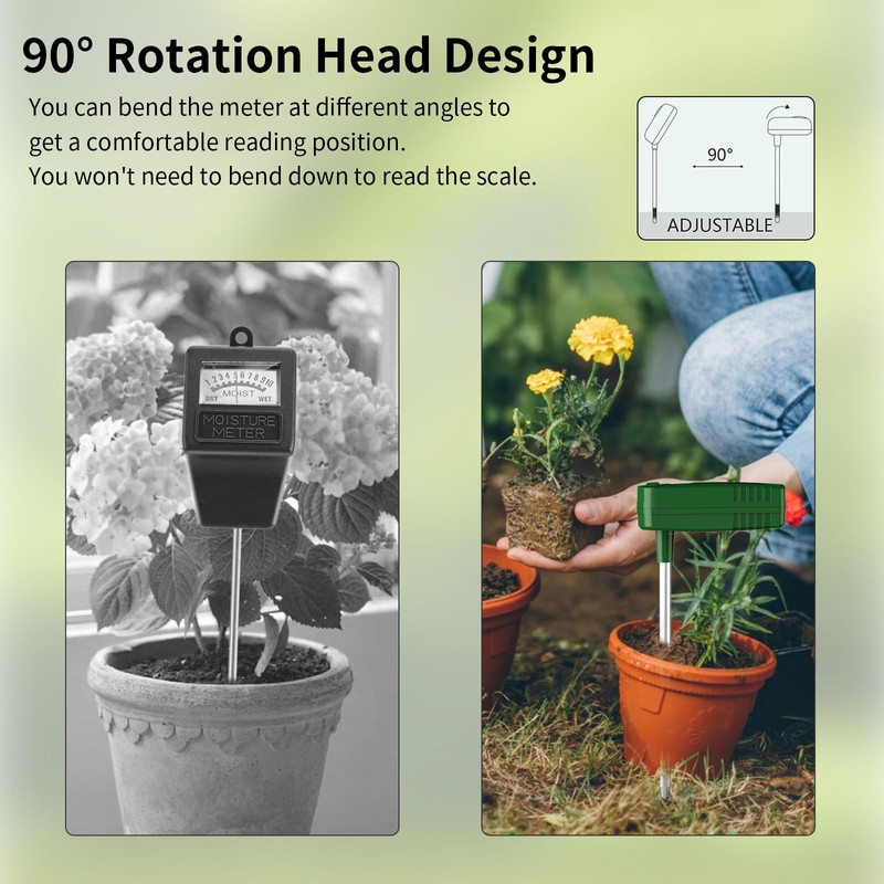 - 【90° Rotation Head】The soil moisture meter with 90° rotating head allows you bend the head from 0° to 90° to get a comfortable reading position. You will no longer need to bend your knees to read the dial