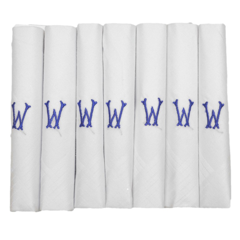 7 Pack Of Mens/Gentlemens White Satin Bordered Handkerchiefs With & Blue Embroidered Initials, W