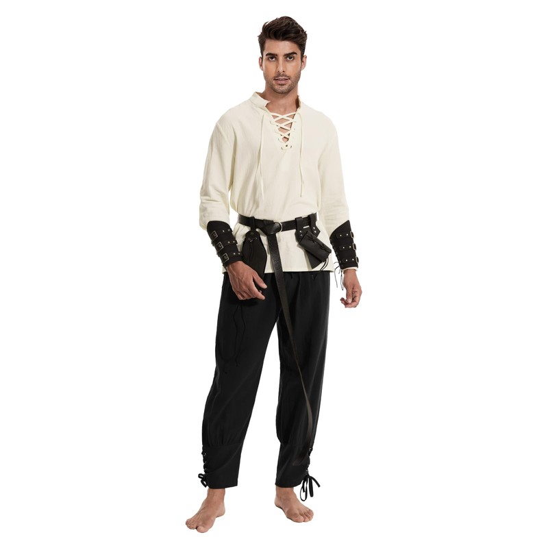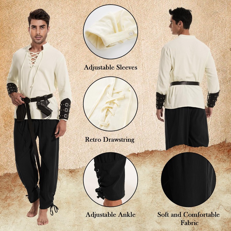 - Authentic Vintage Design:The stand collar pirate shirt with adjustable sleeves, drawstrings, and the lace up ankle length pants are reminiscent of the Renaissance era,Whether you prefer a classic Renaissance costume or a more mysterious aesthetic, this Medieval Viking outfit is an excellent choice.
