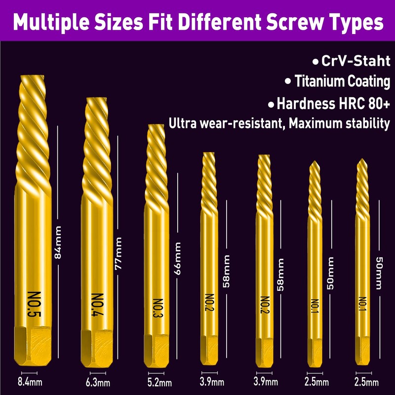 - 【5 Sizes in 1 Set】This 7-piece titanium-coated chrome-vanadium screw extractor set covers M3 to M18, ideal for removing stripped screws in appliance repair, automotive maintenance, and industrial use. With an upgraded HRC 80+ hardness and 50% higher torsional strength, it far outlasts ordinary tools.