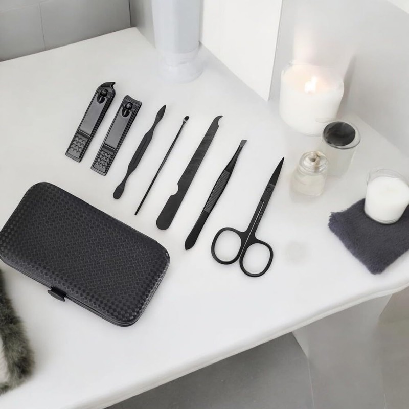 7 Piece Professional Manicure Pedicure Nail Clipper Set Mens & Womens Travel Grooming Kit Includes Eyebrow Scissors, Tweezers, Nail Clippers for fingernail, toenail and Facial Care Black Compact case