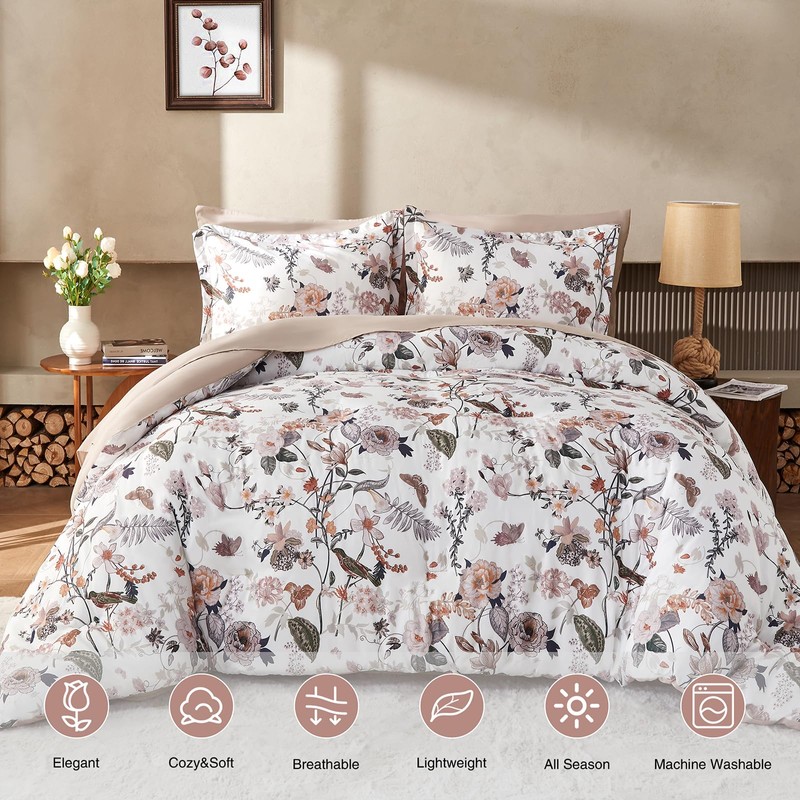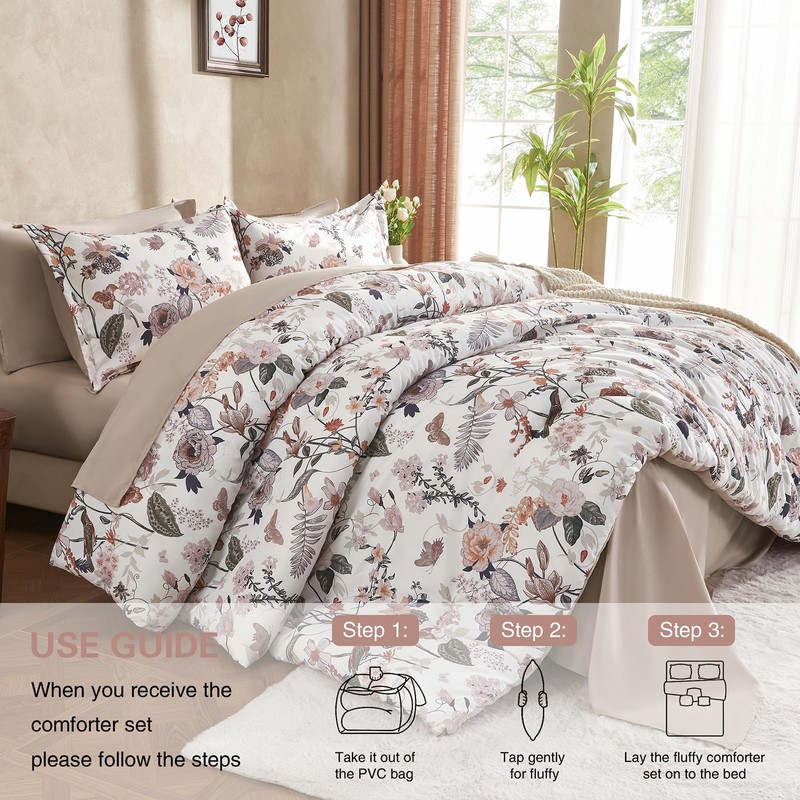 - Easy to Care: Our floral comforter set queen size comes in vacuum-sealed packaging, it may be a little wrinkled when arrived, so you can dry it in low heat or tap the comforter gently while baking it in the sun to fluffy again. The Botanical floral bedding comforter sets are machine washable which can save us more time and energy. Machine wash cold separately, gentle cycle, tumble dry low, No ironing or dry cleaning required