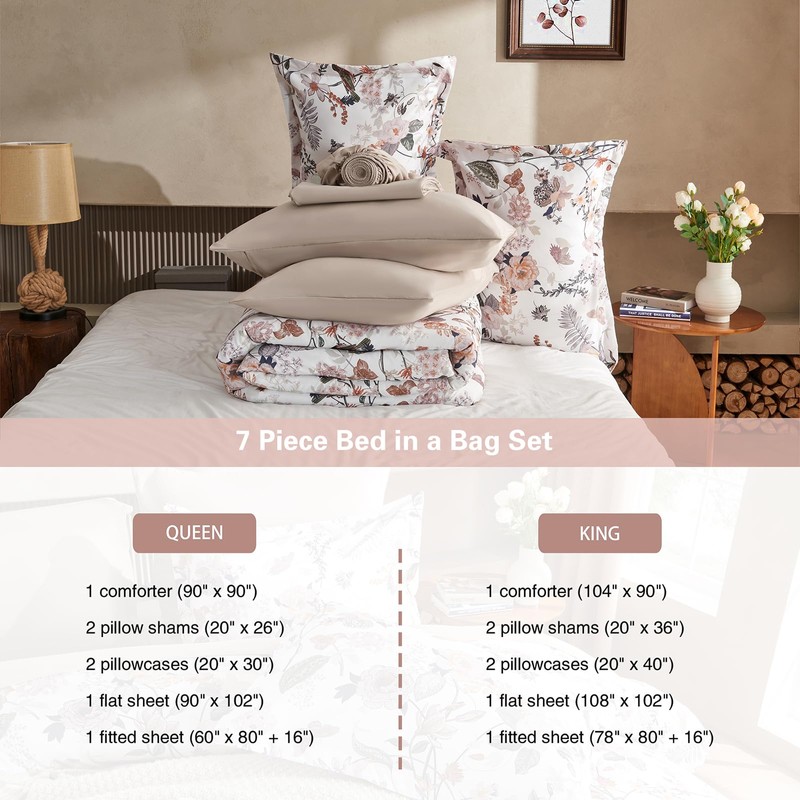 - 7 Pieces Bed in a Bag Set: Sleep with this fluffy and beautifully patterned flower comforter set that brings you to comfort all night. Our boho comforters queen size includes - 1 comforter (90" x 90") + 2 pillow shams (20" x 26") + 2 pillowcases (20" x 30") + 1 flat sheet (90" x 102") + 1 fitted sheet (60" x 80" + 16")