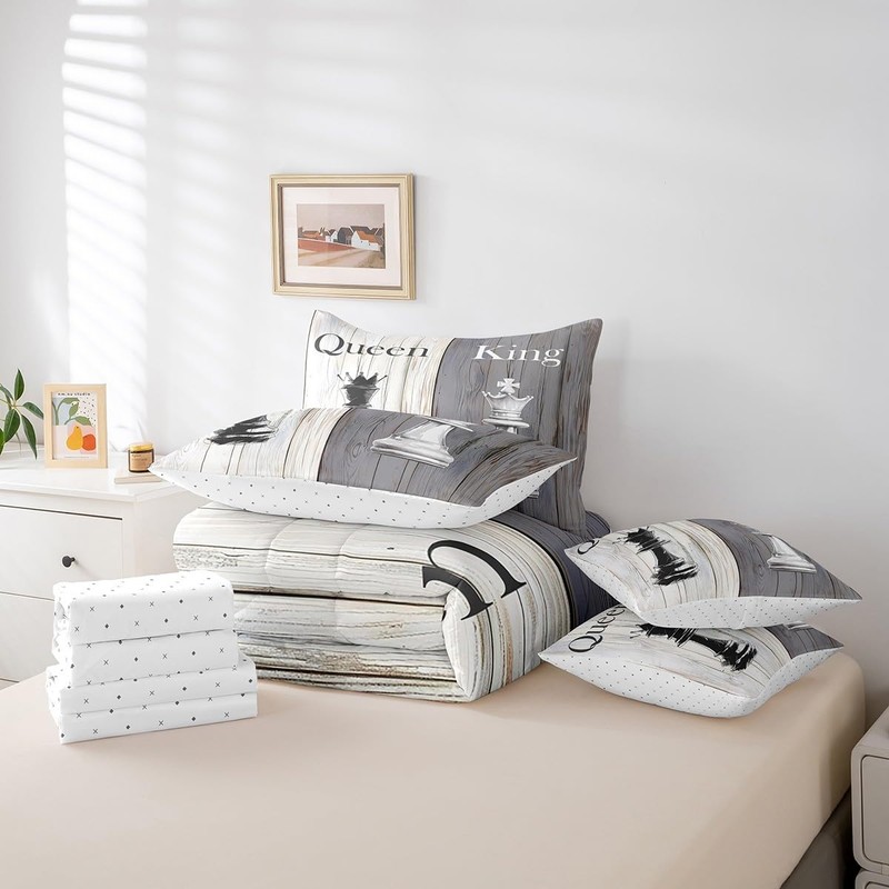 7 Pieces King Size International Chess Comforter Set,Valentine's Sports Games Bedding Set for Boys Girls,Wooden Plank Rustic Retro (Comforter+Fitted+Flat Sheet+2 Pillowcases+2 Throw Pillow Covers)