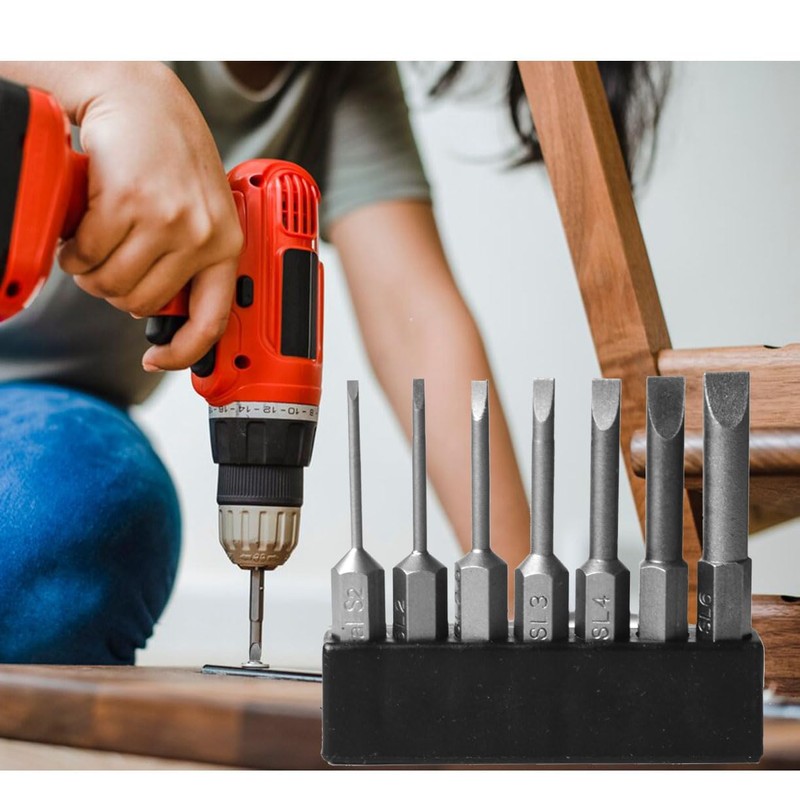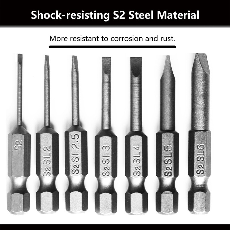 • Comprehensive Set: This set includes 7 slotted screwdriver bits in sizes ranging from 1.6mm to 6.0mm.