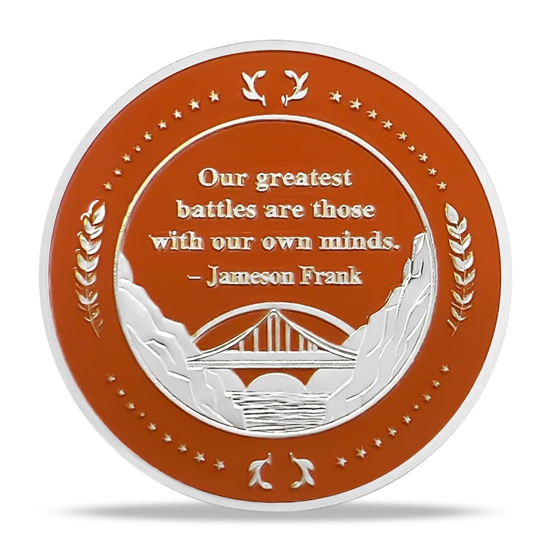 • Elegant Design Front Design: Depicts a serene city skyline with a sailboat on a vibrant river, marked with the words "Seven Years Sober," symbolizing the journey through life's challenges toward sobriety. Back Design: Features the quote, "Our greatest battles are those with our own minds" by Jameson Frank, framed by laurel leaves and a bridge, representing strength, connection, and inner resilience.
