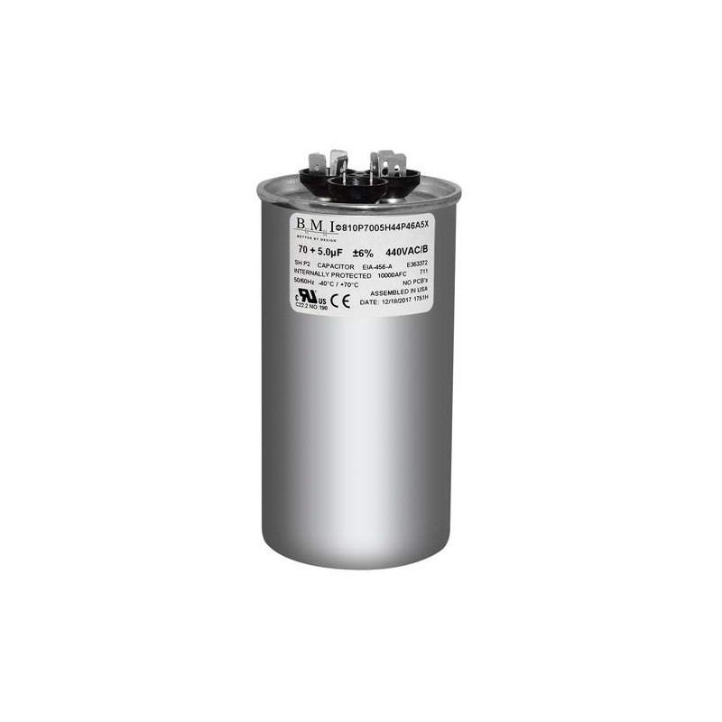 70 + 5 uF x 370 or 440 VAC Round - BMI USA Made Capacitor # 810P7005H44P46A5X Universal Replacement
