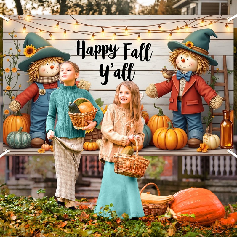 70.8 x 43.3 Inch Fall Pumpkin Photography Backdrop Happy Fall Y'all Banner Autumn Harvest Scarecrow Photo Booth Background for Holiday Thanksgiving Party Supplies