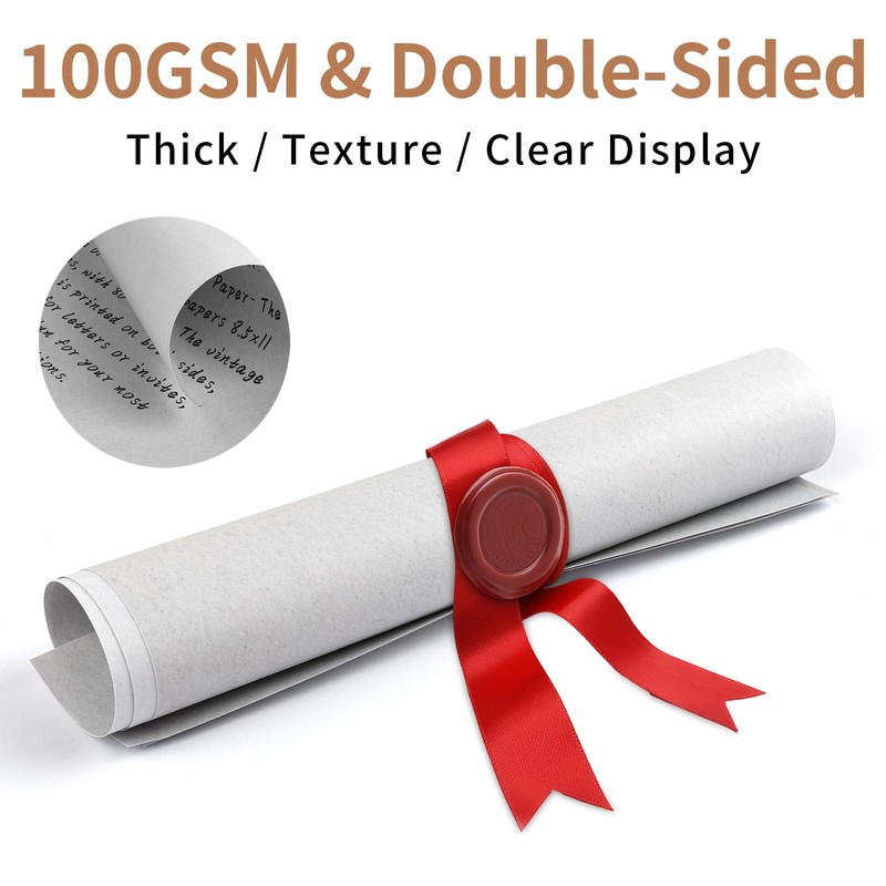 • 100 GSM Thick: Made of 100 GSM thickened antique parchment paper, thicker than normal printer paper, can be printed on both sides, clear imprint, and not easy to bleed through ink
