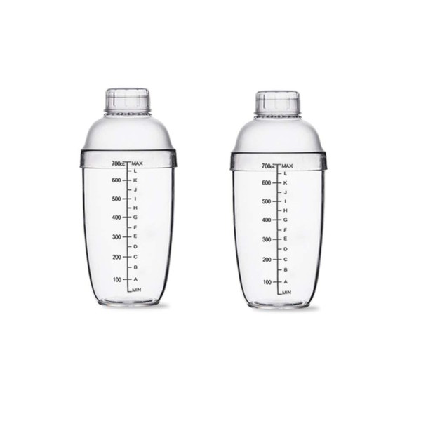 - Plastic cocktail shaker in 24oz(700ml)capacity with cap, built-in strainer and tin. Designed for home and bar. There is graduated line on the surface of bottle and clearly marked the measurement that easily to read