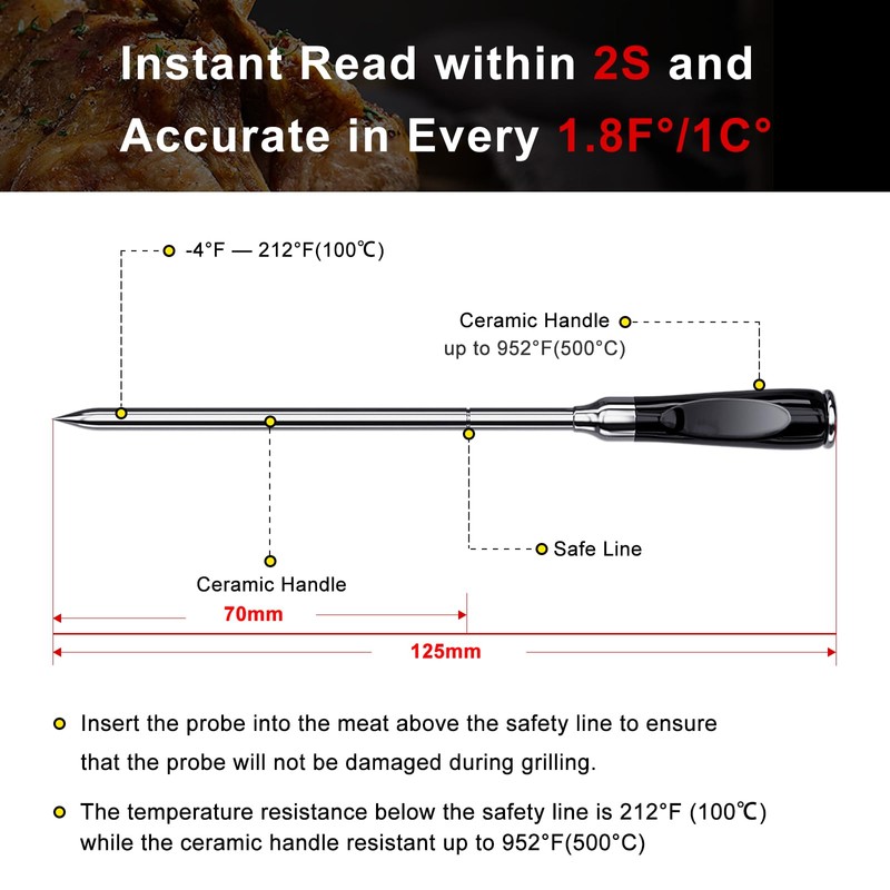 - 🎁【Probe is So Impressive as its Wide Application】Design for various thickness of meat. The only one that covers a full range of small meat barbecues such as pork neck, chicken tenders, pork breast, salmon, etc. Little 3.9mm probe insert meat with less effort. KHSUIN Wireless Meat Probe also nice for use in cramped spaces. So, in an oven it can be on top of a roast and still not be in the way. It's also convenient to use in an air fryer or small frying pan because it won't stick out as far.