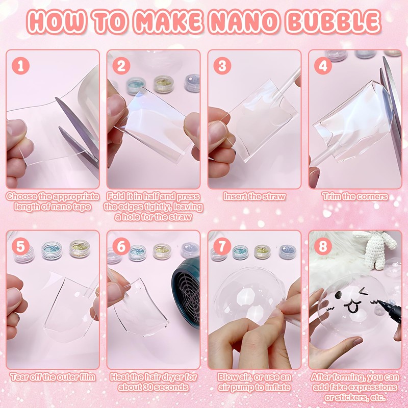 - [Easy to Operate ] With just a few simple steps can blow beautiful and cute bubbles. ①Cut the nano tape as needed, fold it in half into a pocket shape, pinch the edges.②Put in your favorite fillings, such as sequins, sugar grains and other decorations. ③Insert the straw and tear off the surface paper film, use a hair dryer to heat for about 60 seconds. ④Blow bubbles with an air pump or straw. A bubble full of creativity and color is born, bringing you endless fun.