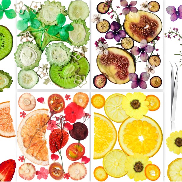 - 4 IN 1 PACK- YouthBro pack with 71pcs pressed flowers and dried fruits, which includes 4 different sheets dried flowers fruits 70pcs in vibrant colors & styles. 1pcs curved tweezers included