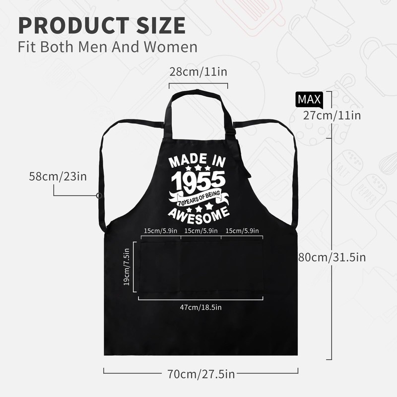 - [Adjustable Size] - The size of this 70th birthday cooking apron is 80CM/31.5INCH (length) * 70CM/27.5INCH (width). You can use the adjustable buckle of the neck strap and the 58CM/23INCH long side strap to adjust the length according to your needs to adapt to most people, whether men or women.