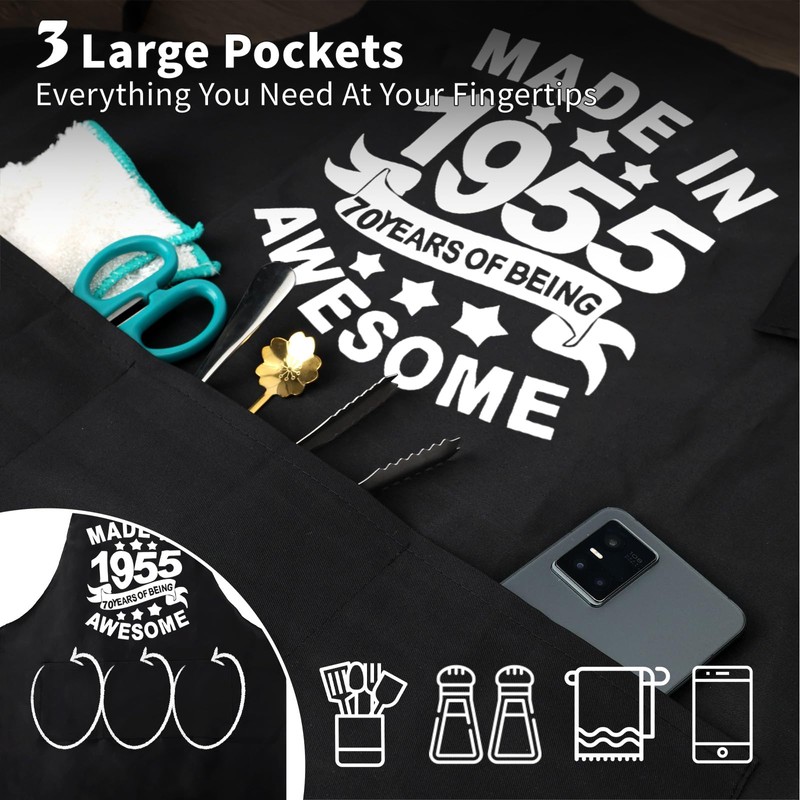 - [Makes Cooking Easier] - This 70th birthday gifts apron has three front pockets, you can put towels, forks, tongs, spices and other kitchen or barbecue accessories, or mobile phones, glasses and other personal belongings, you don't have to run around to find things, make them within reach, improve cooking efficiency. The bbq apron covering the front of the body protects you from grease and stains, keeping you clean and tidy.
