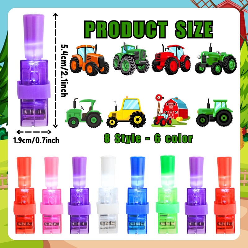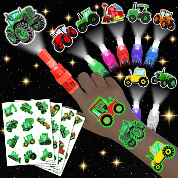 - Tractor-Themed Party Favors Combo – 24PCS LED Finger Lights + 48PCS Pre-Cut Glow In The Dark Temporary Tattoos. Unleash the ultimate Tractor experience with this action-packed party combo! Featuring 24 LED Finger Lights in 8 unique designs and 48 vibrant, pre-cut luminous temporary tattoos, this set is the perfect way to light up any tractor-themed birthday or celebration! Just press the switch to project glowing symbols, then let kids show off their power with easy-to-apply tattoos – no scissors needed!