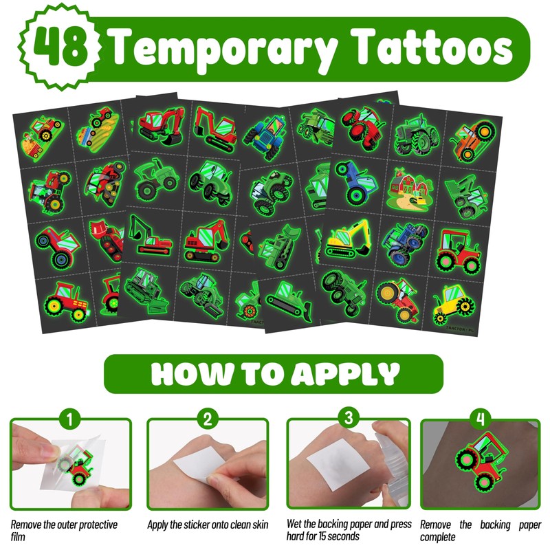 - Perfect Tractor Gifts for Kids: Ideal for goodie bags, classroom rewards, party favors, stocking stuffers, and more. Watch their eyes light up as they share the fun with friends and family! The pre-cut glow in the dark tattoos make it easy for kids to apply and trade without any hassle.