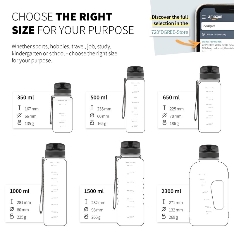 - 💧 YOUR ULTIMATE DAILY HYDRATION BUDDY - Whether you're at the gym, work, university, or simply at home, the generous 1500ml volume makes the "uberbottle XL" your perfect companion for all sweaty and thirst-inducing activities, sports, fitness programs, or just ensuring you drink enough throughout the day without constant refills. The integrated scale helps you monitor your fluid intake, while the practical carrying strap makes transport a breeze.