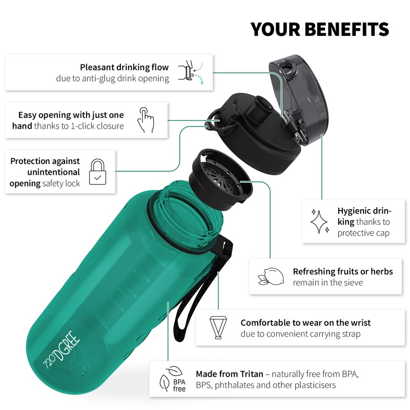 - 💪🌳 HEALTH + ENVIRONMENT - Free from BPA and other harmful substances, the "uberBottle" offers a taste- and odor-neutral drinking experience. The wide opening allows for effortless cleaning, and together with the fruit infuser, it's easy to add ice, fruits, herbs, or 720°DGREE Infuuzed flavors. By choosing the "uberBottle," you're reducing single-use plastic waste and actively contributing to environmental protection.
