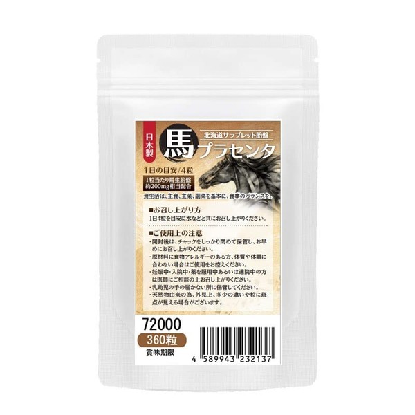 馬プラセンタ72000 お徳用360粒 北海道サラブレット胎盤使用 1日目安/4粒 約3ヶ月分 1袋当たり馬生胎盤 約72,000mg相当配合