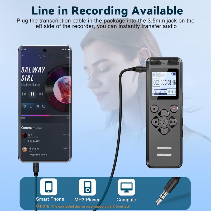 - 【Kopfhörerwiedergabe (Rechts) & Line-in (Links) 】Der Aufnahmegerät hat zwei Lautsprecher für externe Wiedergabeaufnahmen, Lautstärke 0-30 einstellbar; die rechte 3,5mm-Buchse kann nur in kabelgebundene Kopfhörer eingesteckt werden, um Aufnahmen zu hören oder Musik zu hören; die linke 3,5mm-Buchse kann nur in eine Transkriptionsleitung (im Paket) eingesteckt werden, um MP3, Handys, Computer für Line-in anzuschließen