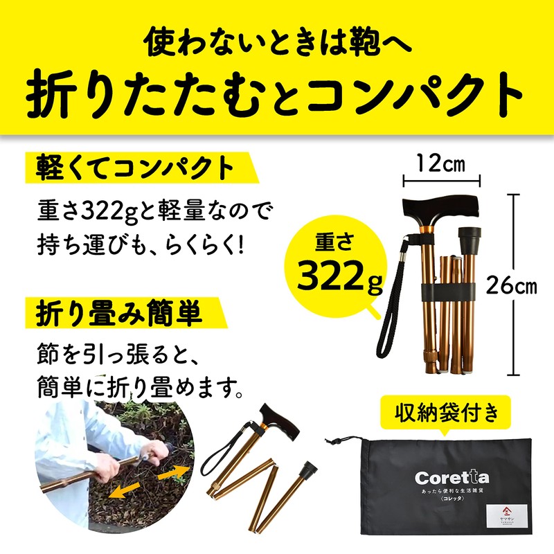 - 【軽量で持ち運び便利】杖本体の重さは約330g!軽量で使いやすいのが特徴です。また、折りたたんだ後は26cmというコンパクトさ。さらに、手首にかけられる補助ストラップも付いているので、持ち運びや収納にも大変便利です。収納の際は収納袋をお使いください。